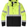 100% polyester 300-denier ripstop shell with durable water-repellent (DWR) finish 4.6-ounce 100% poly microfleece upper body lining 3-ounce quilted polyfill lower body lining 2-ounce quilted polyfill hood and sleeve lining Black bottom front and lower sleeves for a cleaner appearance Fabric waterproof rating: 5000MM Fully seam-sealed Adjustable rain hood Durable reflective 2-inch tape meets ANSI 107 requirements Full-length exterior storm flap Left chest pocket Right chest pocket Two lower front pockets Center front zippered pocket to hold a tablet Mic clips at shoulders Elastic cuffs Elastic hem Decoration access pocket This garment must be fully zipped to be in compliance with ANSI 107 standards