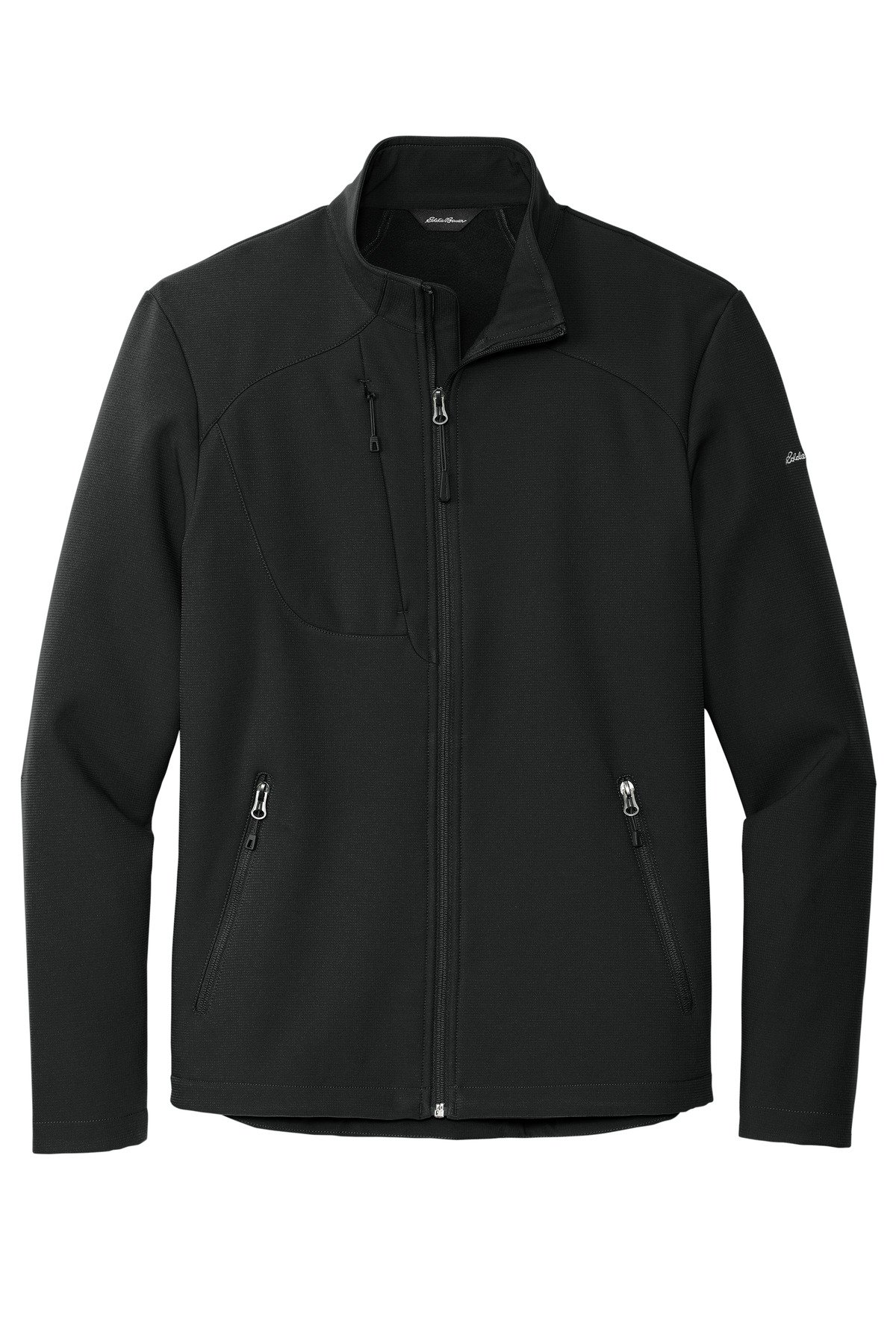 With 4-way stretch a subtle ripstop texture and weather protection-these are the next-generation soft shell jackets to wear on the trails or around town. Made for mobility these 3K/3K waterproof breathable jackets with a durable water-repellent (DWR) finish feature an interior storm flap and chin guard. Streamlined and refined elements include an invisible zippered chest pocket reverse coil center front zipper with an Eddie Bauer logo zipper pull. Adjustable locking drawcord hem and reverse coil zippered hand pockets. Embroidered Eddie Bauer logo on left shoulder. Made of 90/10 polyester/spandex bonded to a waterproof film insert and a 100% polyester fleece lining.