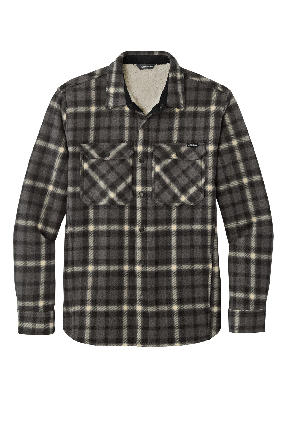 Whether you’re spending time inside or outside in cool temps the high-pile fleece interior of these rugged-looking shirt jacs will keep you warm. Eddie Bauer logo snap-front closure and snap-close chest pockets. Handwarmer pockets. Eddie Bauer woven label at left chest pocket. Made of 10.3-ounce 100% polyester microfleece bonded with 100% polyester high-pile fleece interior. 100% polyester woven details.