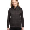 Stretch Knit: 63% polyester, 33% rayon, 4% spandex, 315 grams; Quilted Nylon: 100% nylon, 35 grams; Fill: 100% recycled polyester, 60 grams; Sleek low-profile mock-neck; Center front coil zipper, internal draft flap; Debossed Spyder neck tape & internal locker loop; Strategically placed stretch panels for mobility; Stylized front and back seams; Secure zip hand pockets with phone and coin sleeves; External side drop-in pockets; Elastic cuff binding; Iconic reflective Bug logo at back neck; Reflective Spyder wordmark at left wrist; Global Recycled Standard Certified