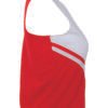 100% polyester double knit; Ladies’ fit; V-neck; Contrast color upper front panel with two-color rib knit trim; Double-needle hemmed armholes and bottom