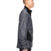 2.8 oz., 100% two-tone yarn-dyed polyester; CONTRAST: 4.9 oz., 95% polyester, 5% spandex double weave; water-resistant finish; inside storm placket with chin guard and metal snap at bottom; center front contrast reverse coil zipper with semi-autolock rubber pull tab; adjustable cuffs with tabs; right-chest pocket and lower pockets; contrast reverse coil pocket zippers; semi-autolock rubber pull tabs and pocket zipper garages; underarm vents for added breathability; audio port access through inside left pocket; adjustable shockcord at back hem with access through pockets