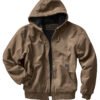 12 oz., 100% cotton quarry washed Boulder Cloth canvas; diamond quilted brushed tricot lined body and hood; articulated elbows; inside cell phone and patch pockets with snap closure; rib knit cuffs and waistband with spandex; heavy-duty metal zipper with DRI DUCK pull