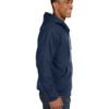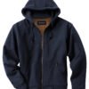 11 oz., 80% cotton, 20% polyester heavyweight Powerfleece; Dark Oxford: 70% cotton, 30% polyester; Triple-needle stitching; Three-piece hood; Inside cell phone pocket; Articulated elbows; textured thermal lining throughout for extra warmth; Heavy-duty metal zipper with DRI DUCK pull