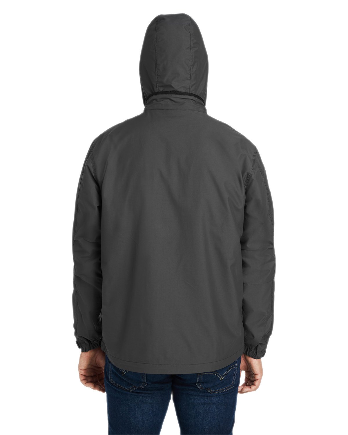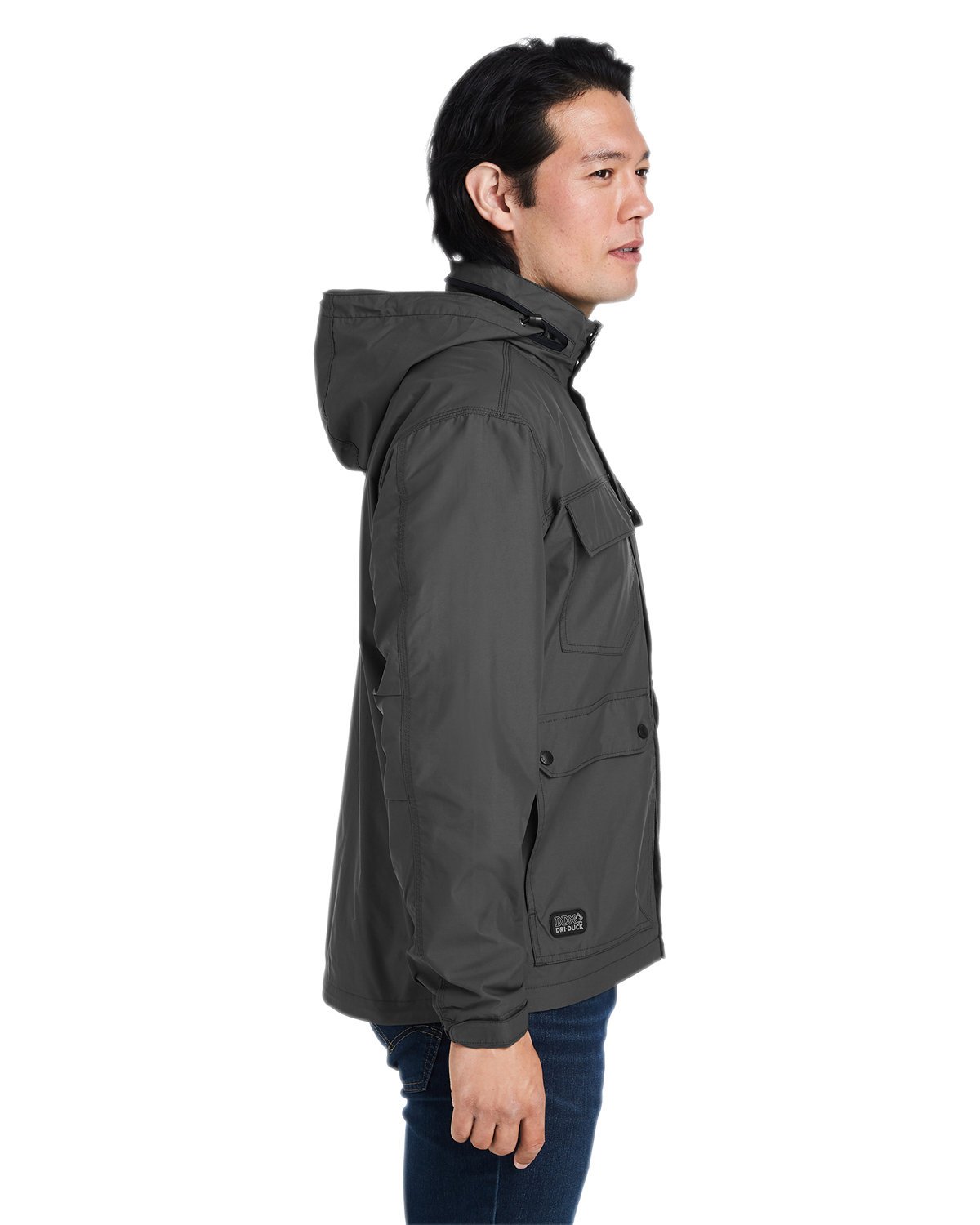 100% nylon waterproof and windproof shell ; 100% polyester mesh lining in the body and hood; Storm Shield water-resistant DWR finish; Full coverage packable hood with adjustable cord lock ; Storm flap with snap closure hidden along entire length; Bellowed double-entry hand pockets with snaps; Adjustable cord-lock cinch at hem with slight drop tail for coverage; Adjustable elastic cuffs with hook and loop cuff tabs