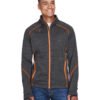 bonded with 100% polyester microfleece, 7.4 oz./yd2/; 100% polyester mélange jersey; inside storm placket with chin guard; contrast center front reverse coil zipper ; stretch storm cuffs with thumb holes; chest pocket with contrast invisible zipper; lower pockets with contrast reverse coil zippers; contrast coverstitch details; audio port access through inside left pocket; adjustable shockcord at hem