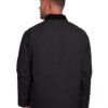 10 oz., heavy-duty cotton duck; Heavyweight quilt-lined taffeta liner; Water-repellent finish; Triple-needle stitched main seam; Heavy-duty brass zipper with storm flap; Collar snaps for optional hood; Two chest pockets with hook/loop closures; Pleated elbows and action back; Knit cuffs and waistband; Manufactured in a LEED (Leadership in Energy and Environmental Design) certified factory