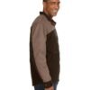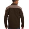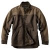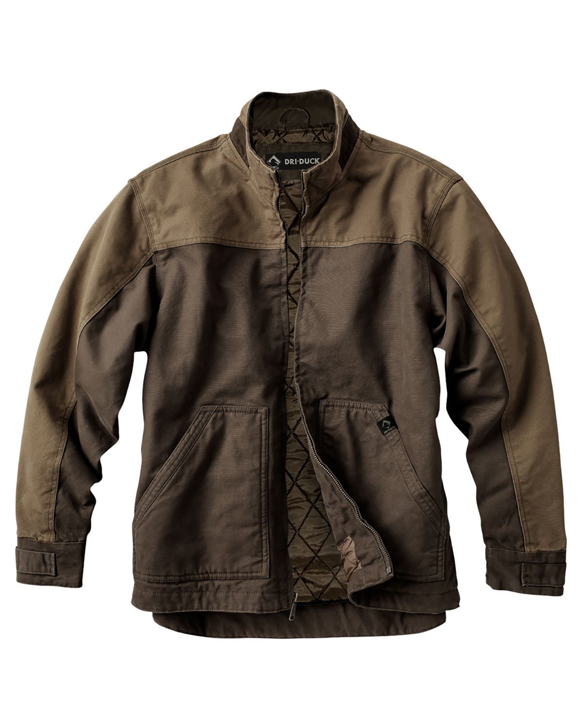 12 oz., 100% cotton quarry washed Boulder Cloth canvas; nylon quilted lining with contrast stitching; zip-thru funnel collar; drop tail with canvas facing; heavy-duty metal zipper featuring a DRI DUCK pull; large insulated front pouch pockets; inside cell phone and patch pocket; articulated elbows; triple-needle stitching