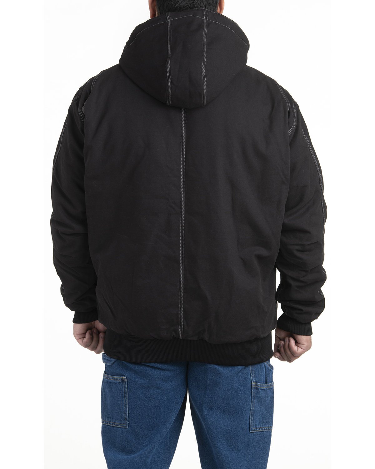 10 oz. Heavy-duty cotton duck; Water-repellent surface; Rain blocker hood; Triple-needle stitched main seams; Pleated elbows; Pleated action back; Brass front zipper; Three inside chest pockets; Three-piece lined hood