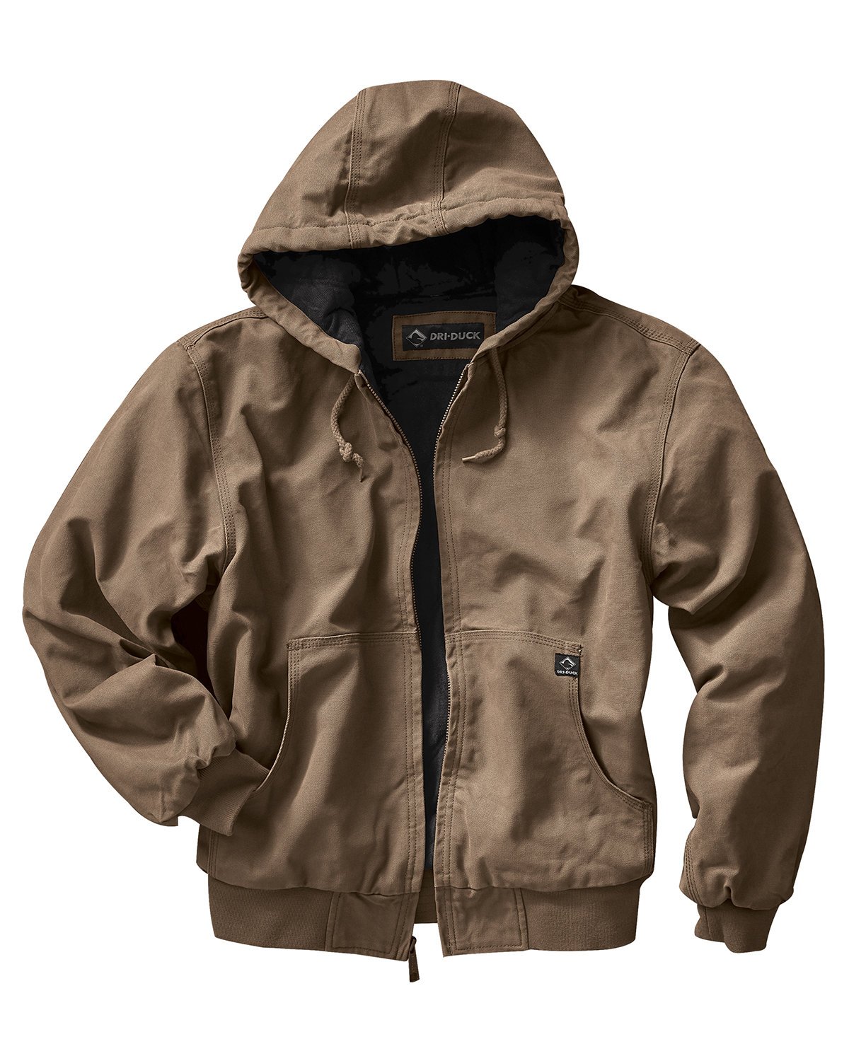 12 oz., 100% cotton quarry washed Boulder Cloth canvas; diamond quilted brushed tricot lined body and hood; articulated elbows; inside cell phone and patch pockets with snap closure; rib knit cuffs and waistband with spandex; heavy-duty metal zipper with DRI DUCK pull