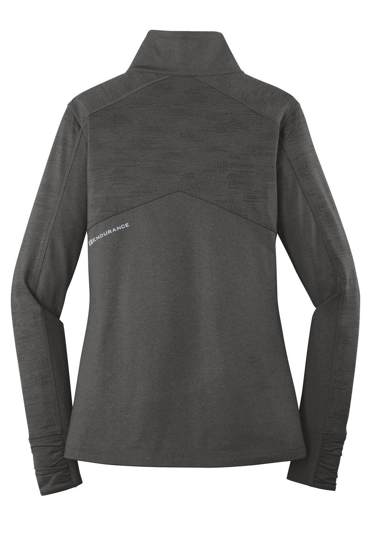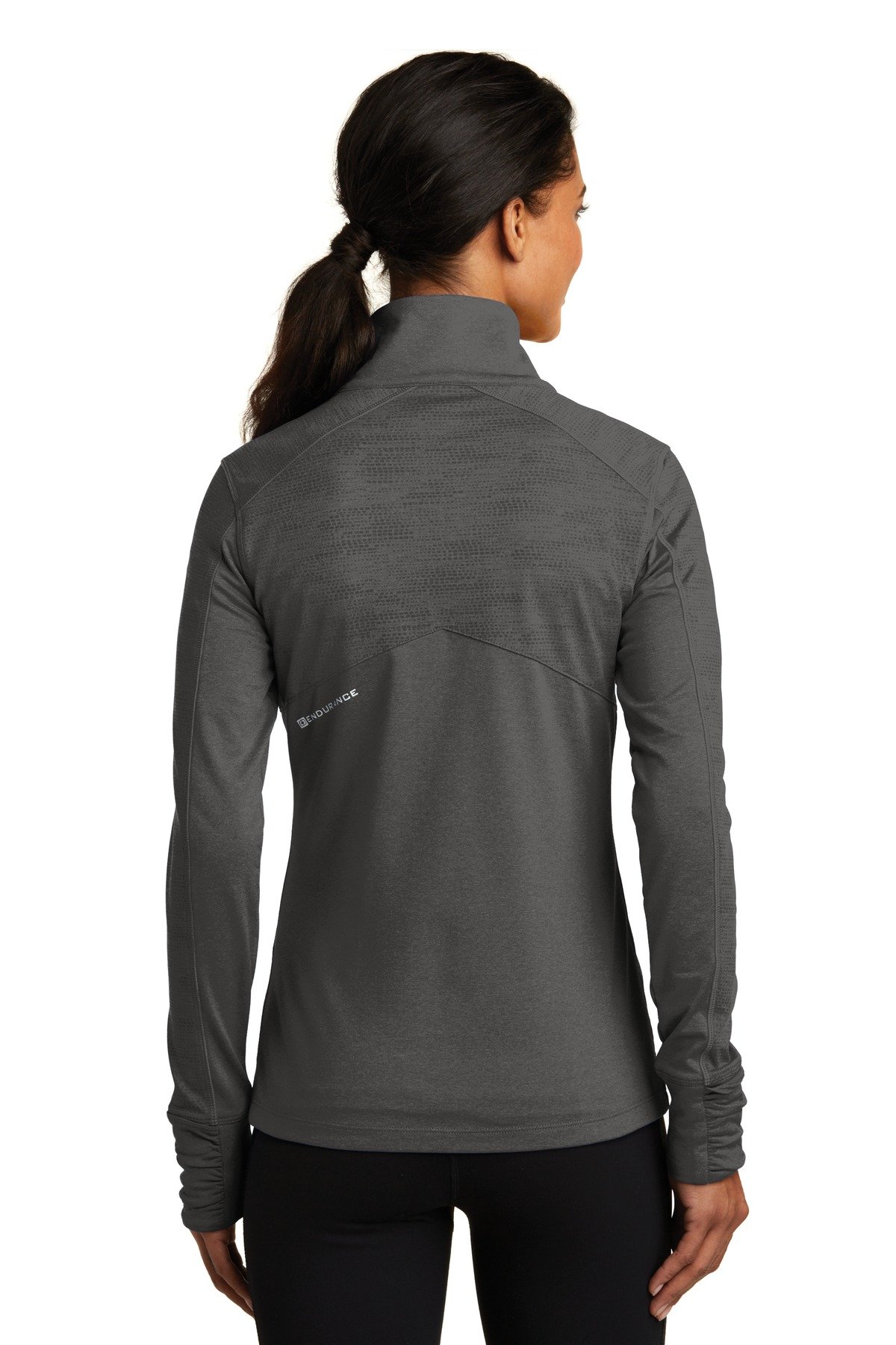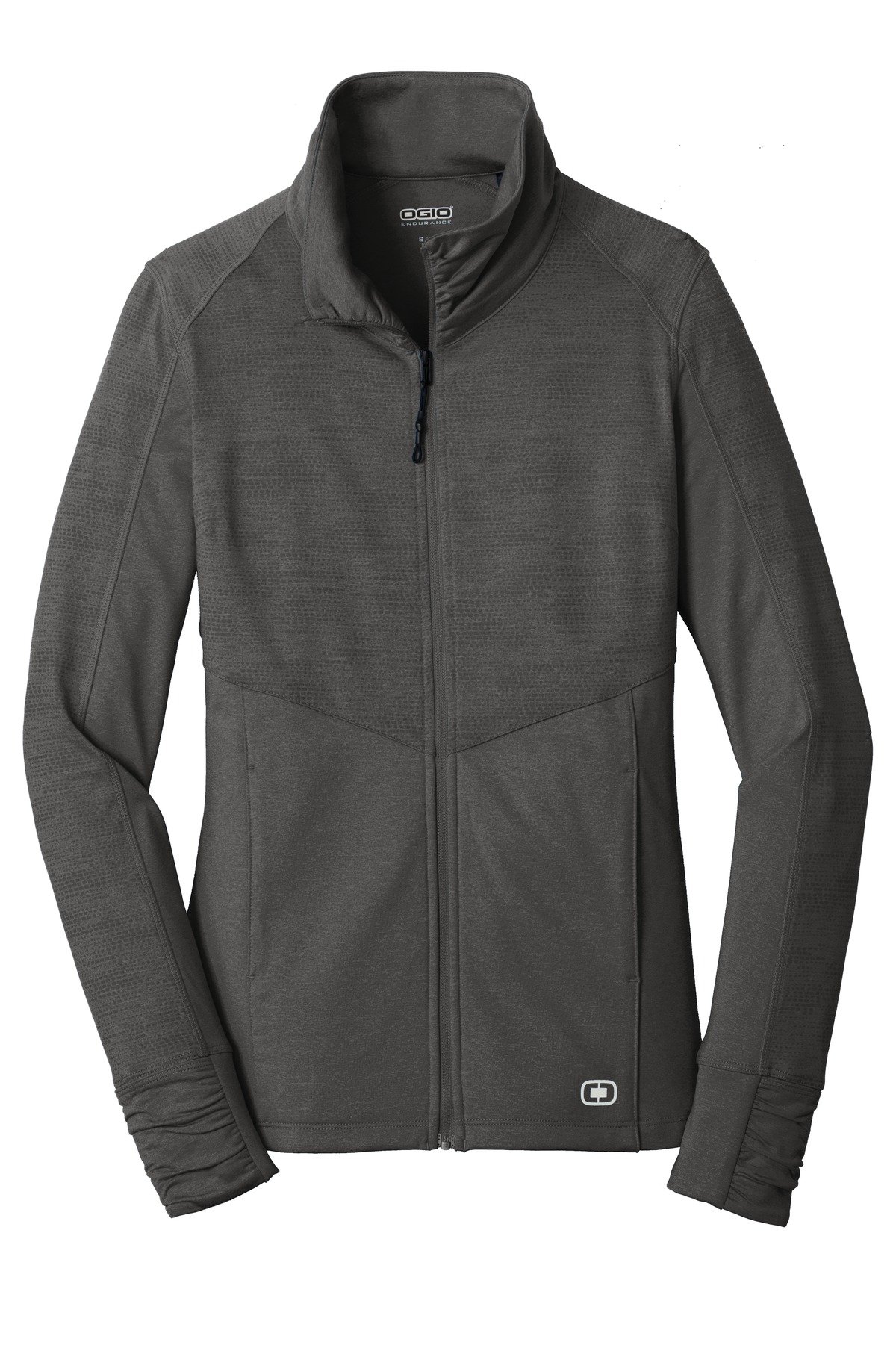 LAYERABLE WARMTHSTRETCHFLATLOCK SEAMS FOR COMFORTREFLECTIVE DETAILS6.8-ounce 90/10 poly/spandex Zip-through cadet collar Ruching at collar Reflective OGIO heat transfer label for tag-free comfort Tonal printed O pattern on heathered yarn-dyed fabric Reflective O heat transfer at back left panel Rubber-wrapped O zipper pull Set-in sleeves Mitten cuffs for warmth Front pockets Reflective O heat transfer at left hem