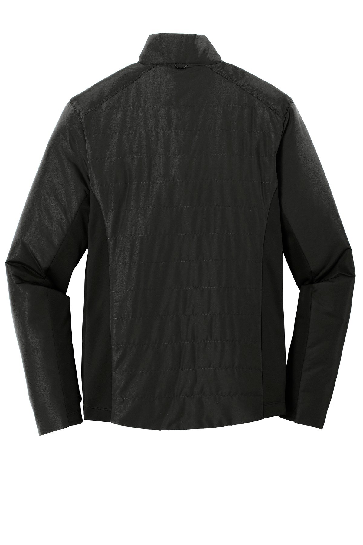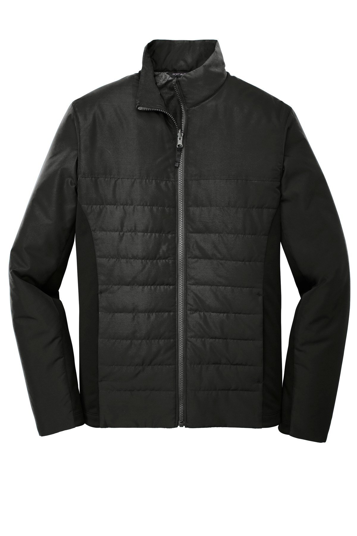 This jacket combines the warmth of low-bulk quilted insulation with flexible soft shell side panels for a trend-right weather-resistant look. Can be zipped in and secured by snap attachments inside an outer Collective layer 100% polyester woven shell 100% polyester printed lining with 100% polyfill insulation behind the outer quilted woven shell 100% polyester knit bonded to a water-resistant film insert and a 100% polyester microfleece lining at side panels and under arms Slightly longer length Molded center front zipper Stretch side panels Open front pockets Port Pocket for decoration access