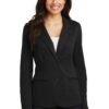Mix it up at the office or after work with this versatile modern blazer. Designed for layering comfort this easy-to-wear deconstructed style can go from refined to casual and resist wrinkles all day long. 8.5-ounce 52/48 cotton/poly ponte knit Peak lapel Front and back darts Welt pockets 2-button front closure Back vent