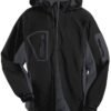 This fully waterproof wind-resistant and tech-savvy jacket delivers complete protection without the bulk. Made with a polyester woven shell bonded to polyester microfleece this color blocked soft shell is great for cold days. Movement is a breeze with four-way stretch fabric. Plus the interior MP3 pocket keeps the tunes coming in this sleek urban jacket. 95/5 poly/spandex woven shell bonded to a water-resistant film insert and a 100% polyester microfleece lining 5000MM fabric waterproof rating 3000G/M fabric breathability rating Fully seam sealed and waterproof zippers for complete protection Vertical welded waterproof zippered chest pocket Snap-off hood Welded waterproof sleeve pocket Interior storm flap with chin guard Molded adjustable tab cuffs with hook and loop closures Port Pocket for decoration access Drop tail hem