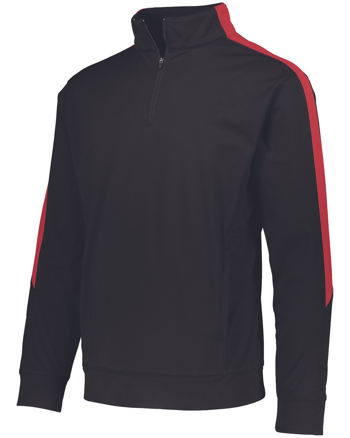 Heavyweight 100% polyester matte brushed tricot; Heat-seal label; Quarter-zip pullover style; Contrast color inserts; Set-in sleeve; Front pouch pocket; Self-fabric cuffs and bottom band
