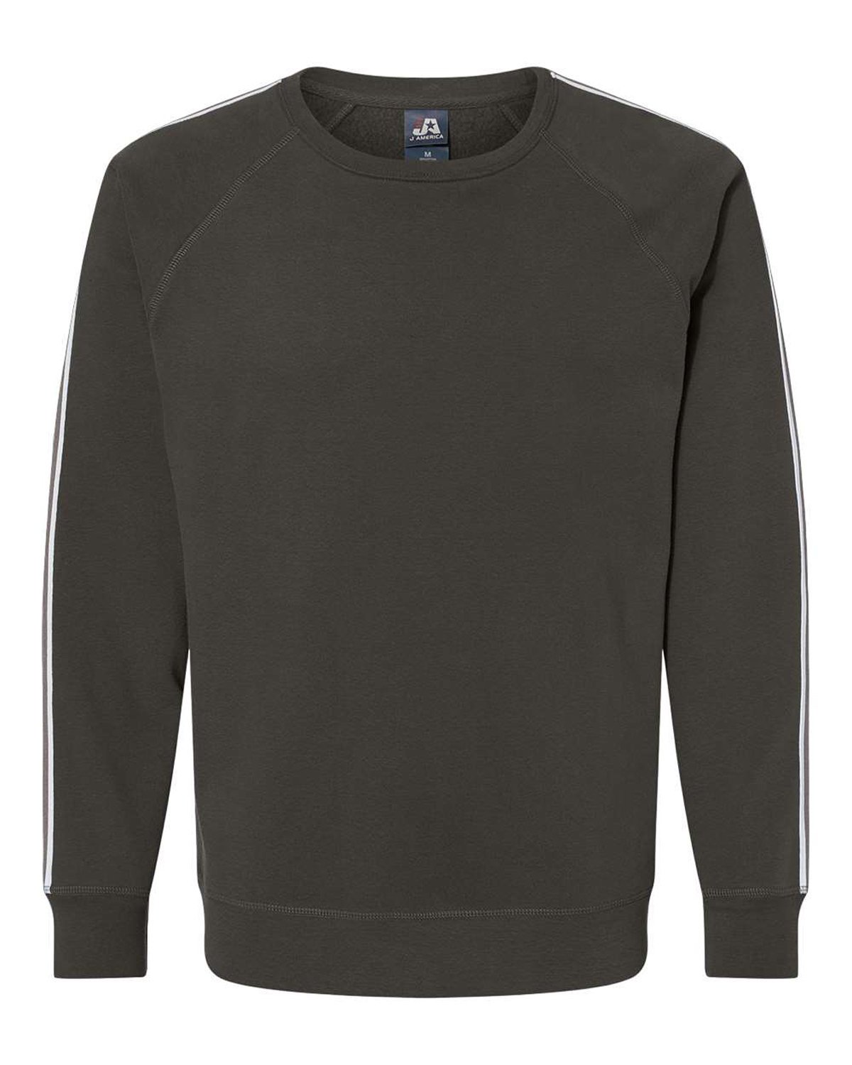8 oz., 60% cotton, 40% polyester sueded fleece; 1” wide set-on striped woven taping along sleeves; Self fabric side gusset with no side seam; Twill tape back of neck tape; 1×1 rib collar, cuffs and waistband; Tear away label
