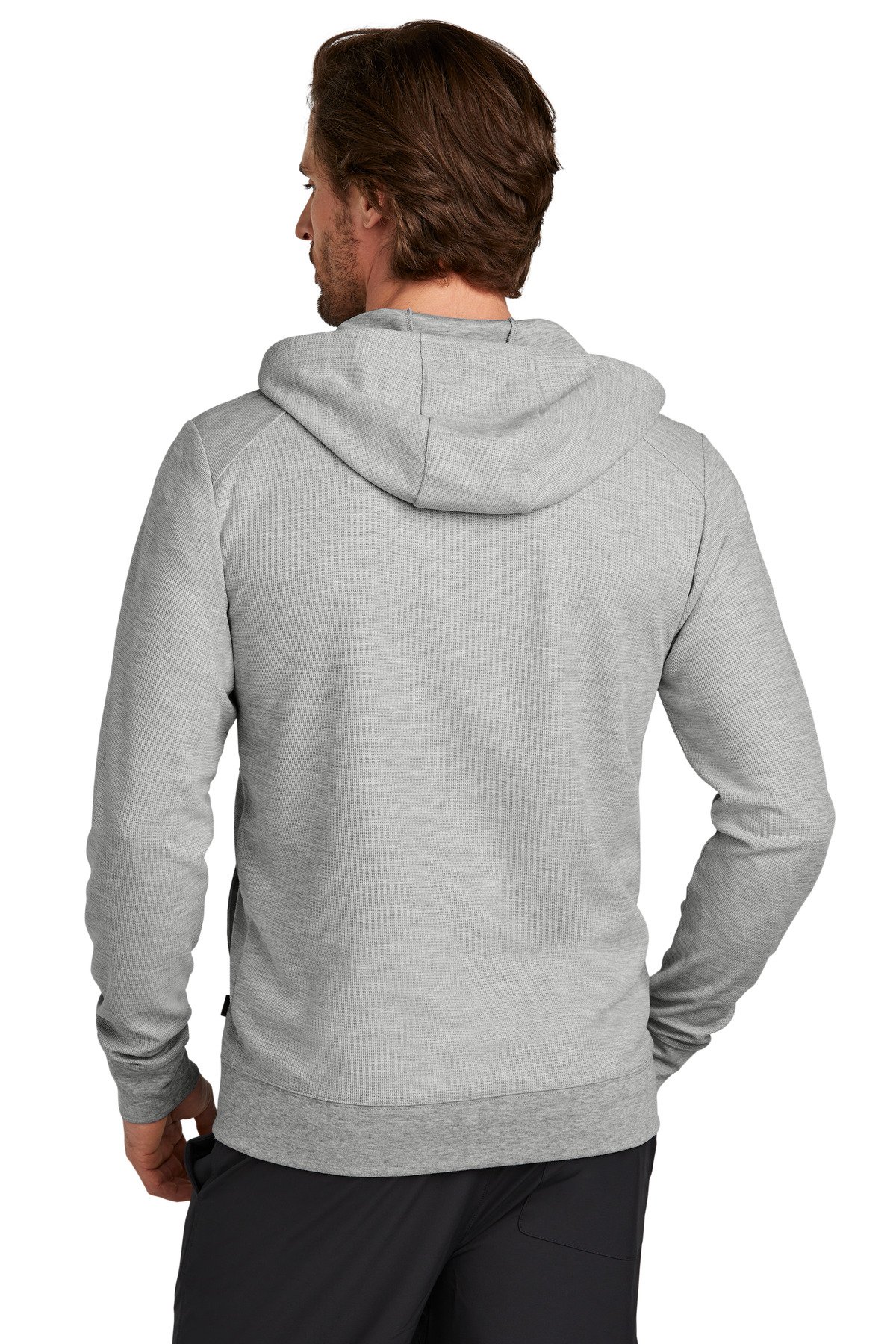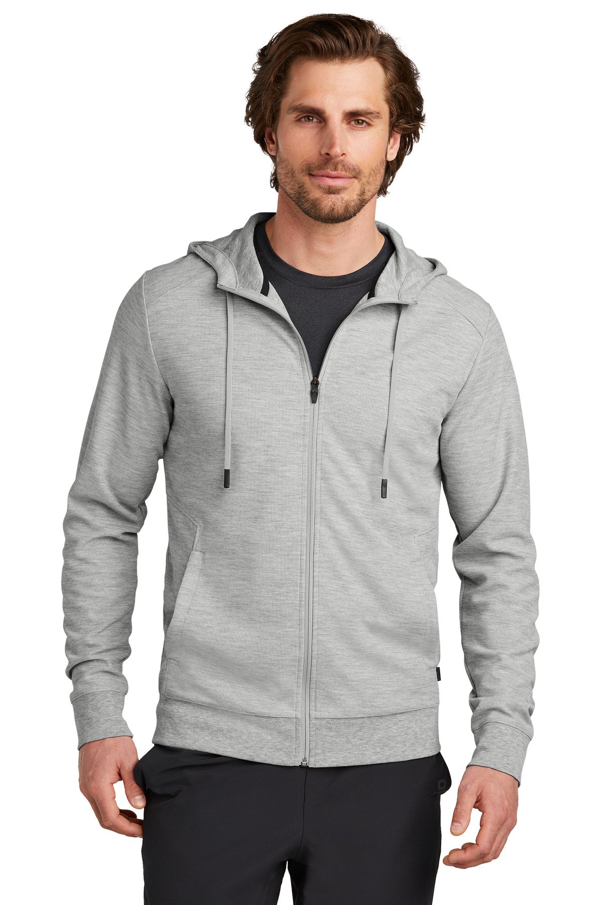 Revive your corporate or casual wardrobe with this comfortable versatile double-knit layering essential that has modern angled lines and OGIO edge. 9-ounce 67/30/3 poly/rayon/spandex double knit (Blacktop) 9-ounce 65/32/3 poly/rayon/spandex double knit (Light Heather Grey) OGIO heat transfer label for tag-free comfort 3-panel hood Matte black eyelets with stretch drawcords and matte black dipped tips Reverse coil zipper Open pockets Rib knit cuffs Black woven OGIO label on left hip Rib knit hem