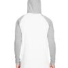 4.5 oz., 60% combed ringspun cotton/40% polyester fine jersey ; fit: adult unisex – true to size; contrast three-piece hood construction; contrast cotton-hand flat braided drawcord; contrast raglan long-sleeve; Easytear label; sideseam construction; double-needle hemmed sleeves and bottom; drop tail with side vent construction