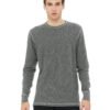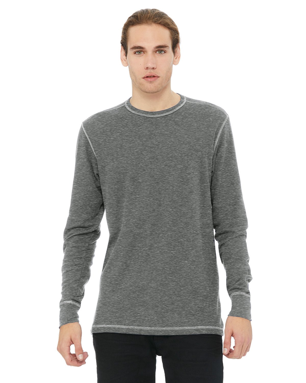 4.5 oz., 55% combed and ringspun cotton, 45% polyester; 40 singles; Deep Heather/Deep Heather is 60% combed ringspun cotton, 40% polyester; Black/Black, Deep Heather/Deep Heather, and White/White – no contrast stitching; Retail fit; Mini waffle thermal; Contrast coverstitch at the neck, shoulder, armhole, sleeve and bottom hem; Sideseamed; Tear-away label