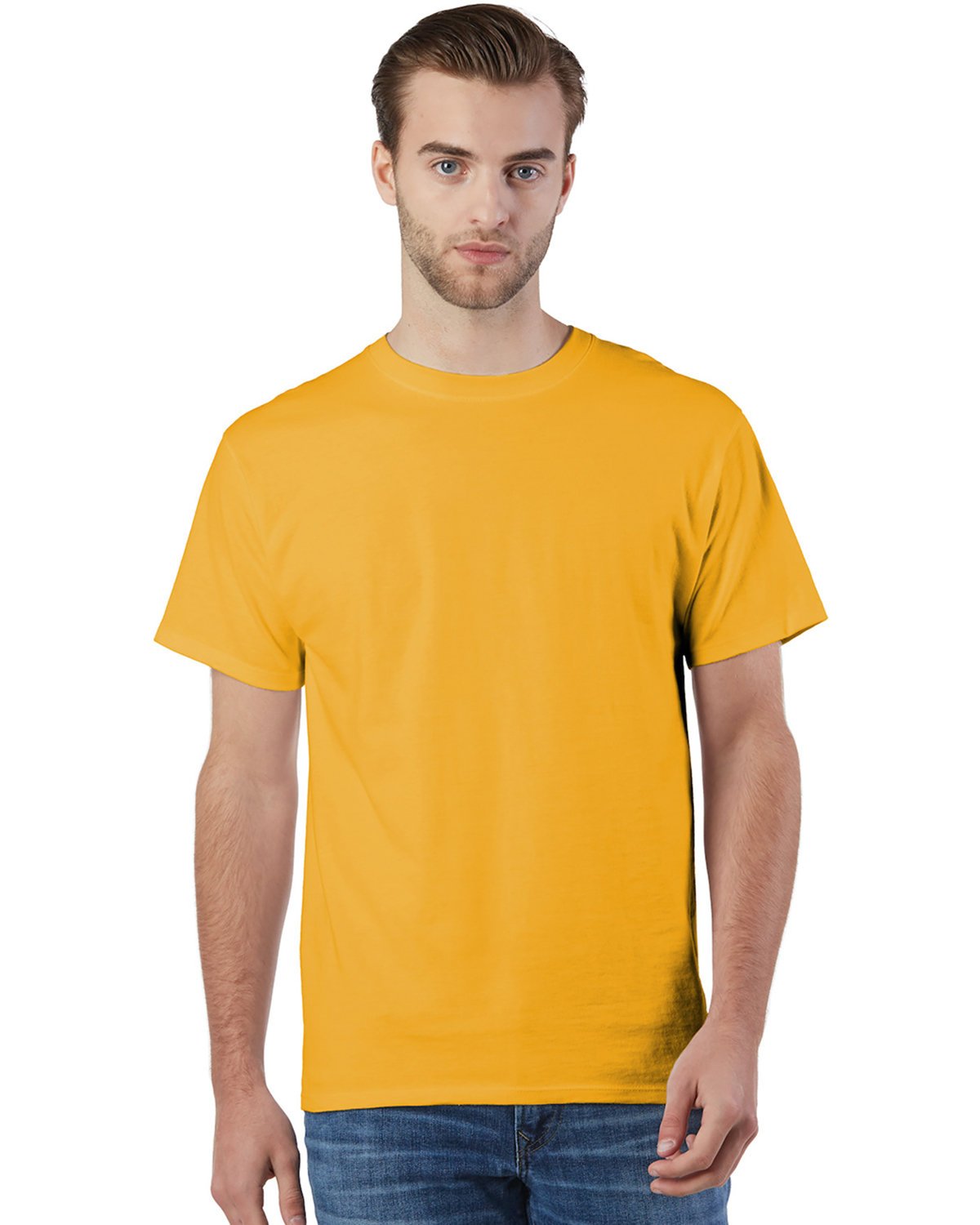 5.5 oz., 100% ringspun cotton; Charcoal Heather is 60% cotton, 40% polyester; Made with sustainably sourced USA grown cotton; Tag-free neck label; Shoulder-to-shoulder neck tape; Double-needle sleeves and bottom hem with ribbed cuff; C logo on left sleeve; Side seamed; A list status from CDP (Carbon Disclosure Project); Energy Star Partner of the Year (12 consecutive years); Every piece of Champion apparel purchased from our company qualifies for Hanes4Education