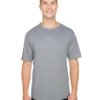 100% polyester heather tee, 4.2 oz. per square yard; Odor resistant and stain release fabric for easy care; Moisture management for all season comfort; Neck seam cover-stitched for extra durability; Tag-free neck