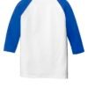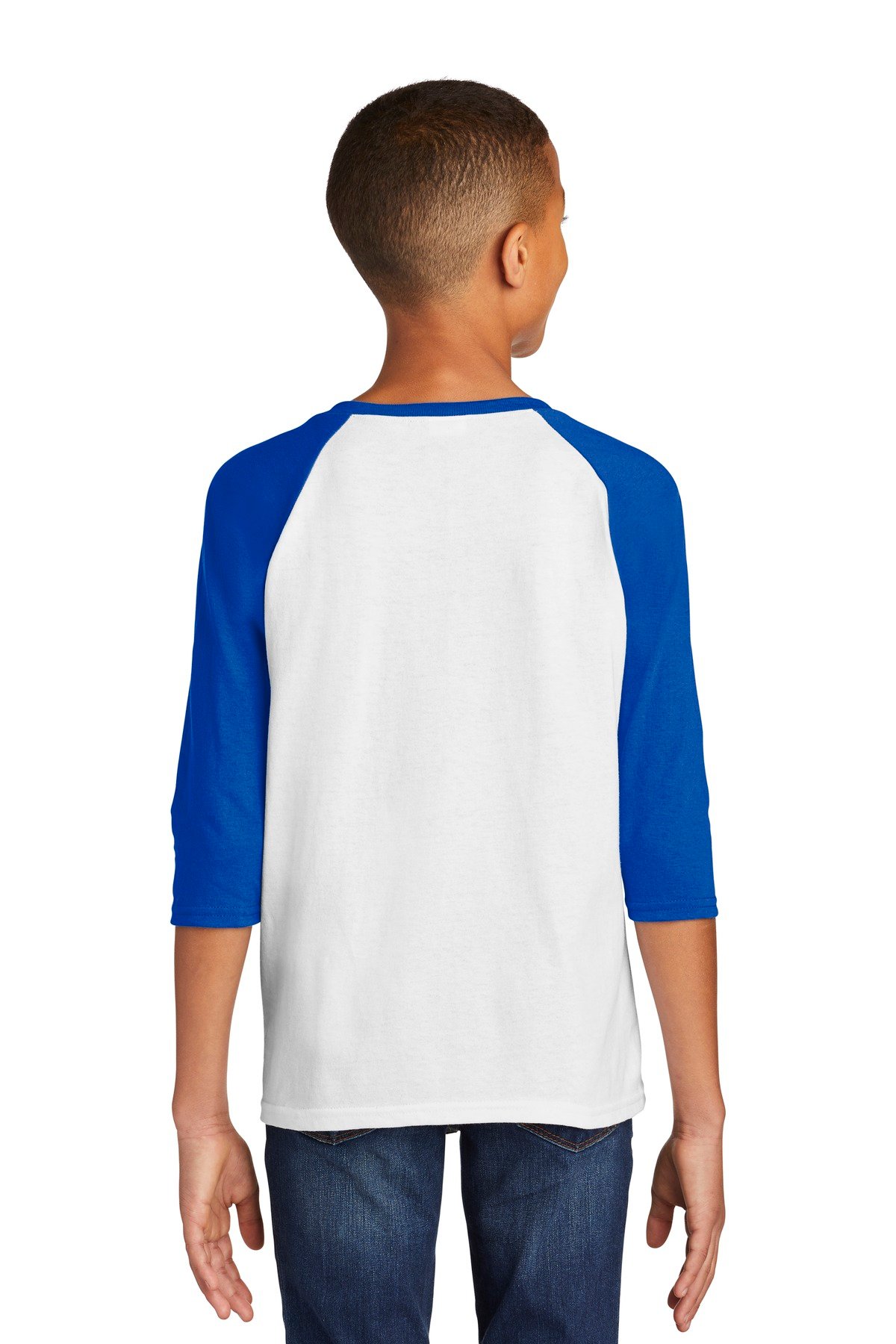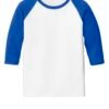 5.3-ounce 100% cotton Tearaway label Contrast color set-in collar and 3/4 raglan sleeve Single-needle topstitched back neck Double-needle sleeve hems and bottom hem/li>