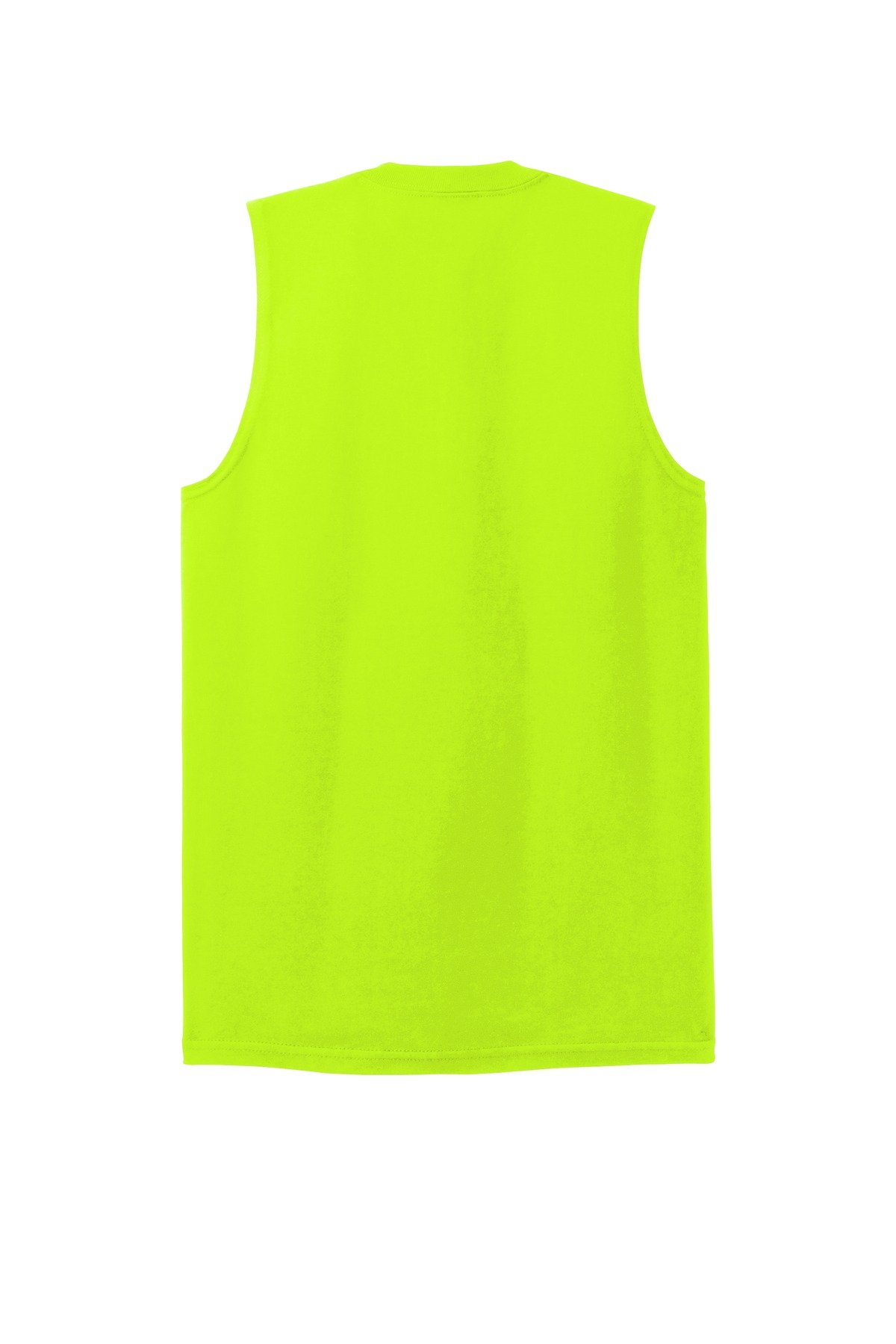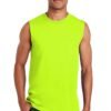 6-ounce 100% cotton50/50 cotton/poly (Safety Green) 90/10 cotton/poly (Sport Grey) Seamless double-needle 7/8 neckDouble-needle armholes and hem Due to the nature of 50/50 cotton/poly neon fabrics special care must be taken throughout the printing process.