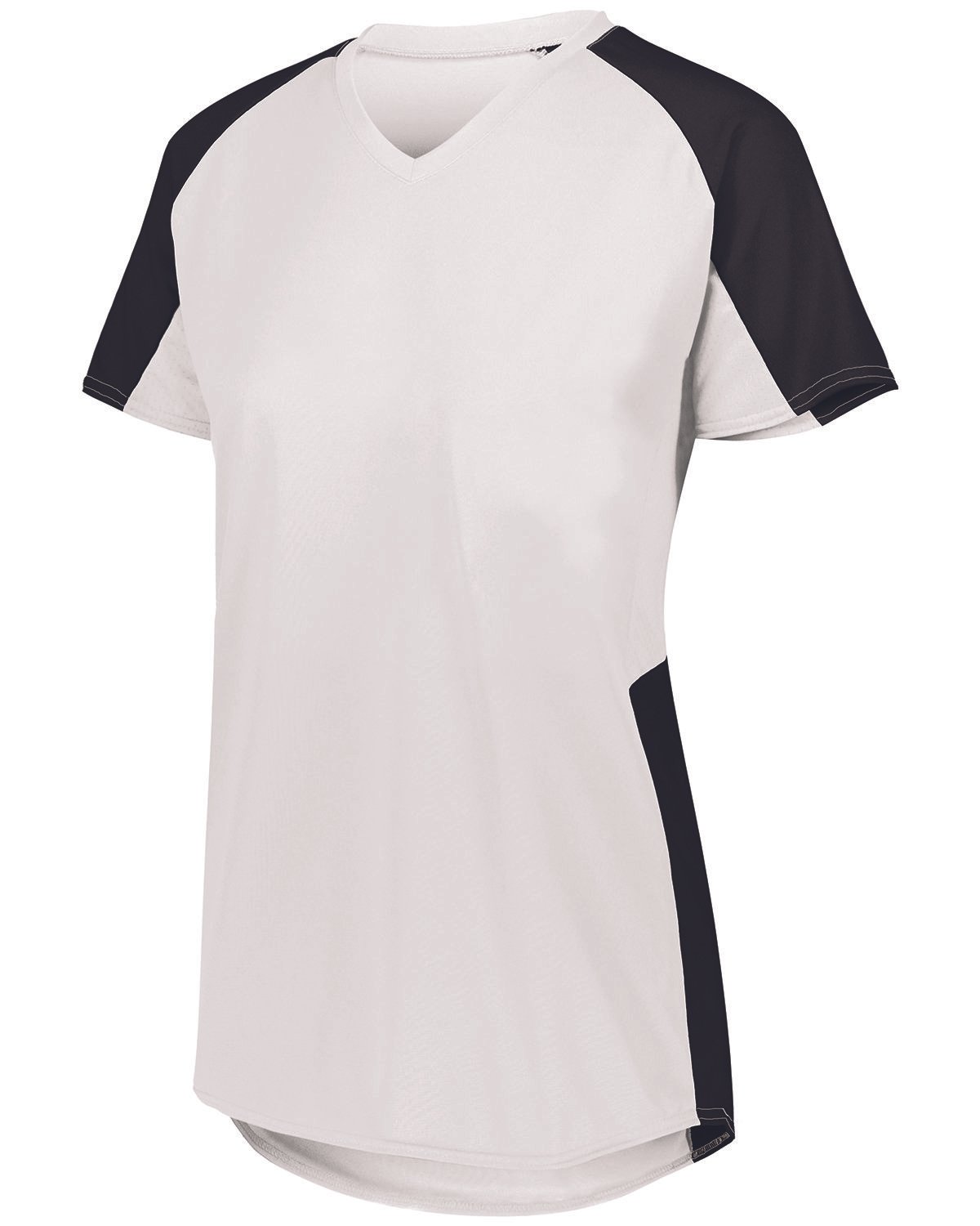 100% polyester wicking knit; 92% polyester, 8% spandex wicking pinhole mesh underarms; Color secure technology helps prevent dye migration; V-neck collar; Raglan sleeves; Contoured bottom; Tagless label