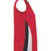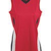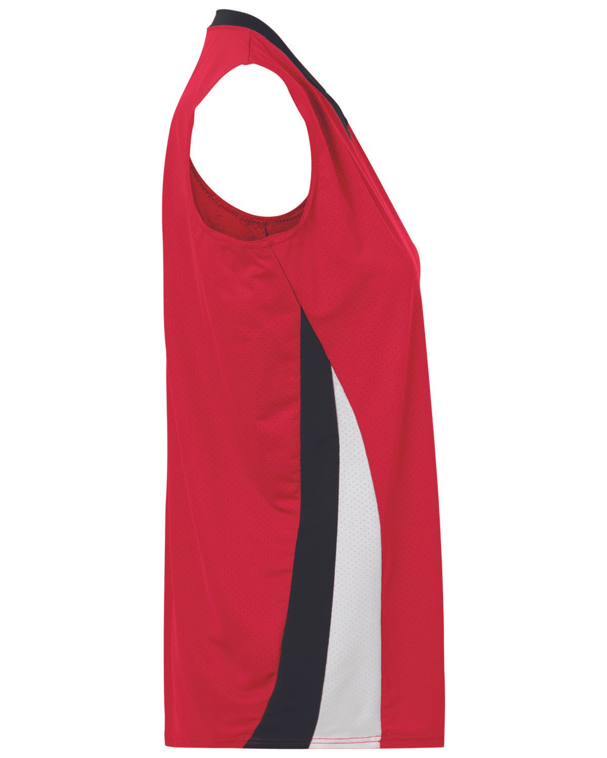 92% polyester, 8% spandex wicking pinhole mesh; Wicks moisture away from the body; Girls’ fit; Heat-seal label; Contrast color self-fabric V-neck collar; Two-color triangular front panels at bottom hem; Double-needle hemmed armholes and bottom