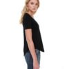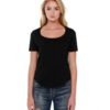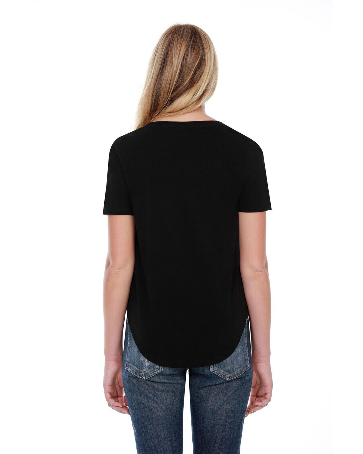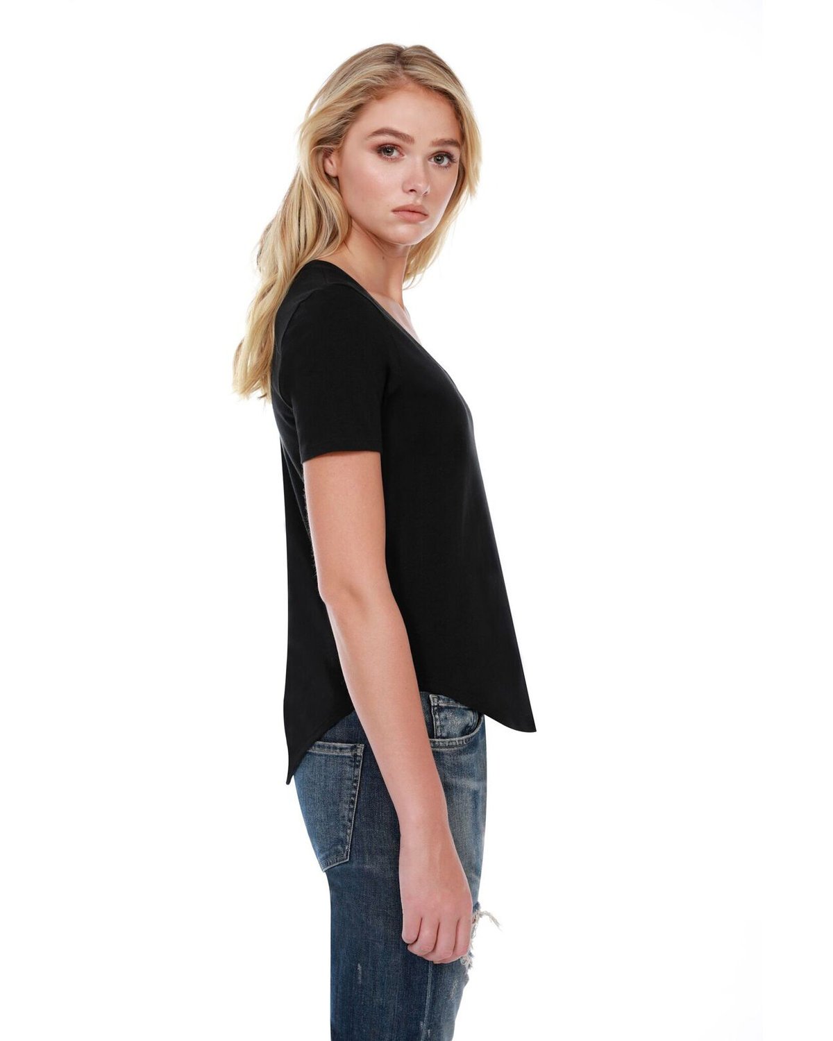 3.5 oz., 100% combed and ring-spun liquid cotton; 40 singles; Optimal stretch and recovery; Fashion fit; Side seams; U-neck; Scalloped hem; Loose fit; Tear-away label; Made in a W.R.A.P. certified factory