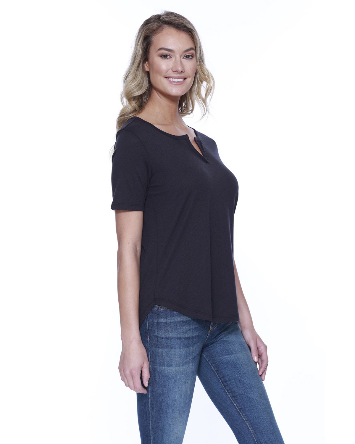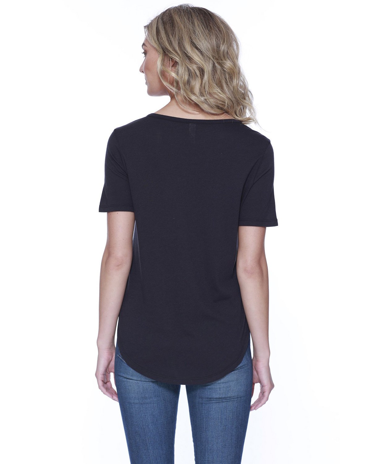 4.3 oz., 52% cotton 48% polyester; 30 singles; Ultra-Fine Cotton Blend; Fashion fit; Side seams; Moroccan style neck; Relaxed fit; Tear-away label; Made in a W.R.A.P. certified factory