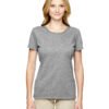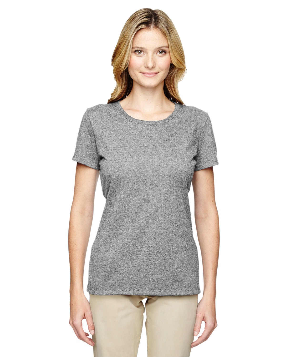 5.4 oz., 50% cotton, 50% polyester; Made with sustainably sourced USA grown cotton; Double-needle coverstitched front neck; Shoulder-to-Shoulder tape; Double-needle stitched hemmed sleeves and bottom; Seamless 1X1 rib collar; Classic ladies’ styling with feminine neckline and sleeves; Sideseamed and slightly contoured for flattering fit; Jerzees styles are manufactured using sustainable protocols which are measured and reported annually by Fruit of the Loom, Inc.; Jerzees styles are manufactured with the commitment to enriching lives for people and communities which is measured and reported annually by Fruit of the Loom, Inc.