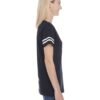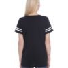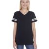 4.5 oz., 100% combed ringspun cotton fine jersey ; CVC Colors are 60/40 combed ringspun cotton/polyester; Topstitched ribbed v-neck collar; Self-fabric back neck tape; Coverstitched front and back yoke; Contrast topstitched self-fabric sleeve stripes; Double needle sleeves and bottom hem; Side seam construction; EasyTear™ label; Machine washable/ tumble dry low; Fit: Ladies’ Modern – Semi-Fitted; Note: Color descriptions indicate Body and Sleeves/Stripe colors, e.g. Vintage Red/Blended White indicates Vintage Red shirt with Blended White sleeve stripes.