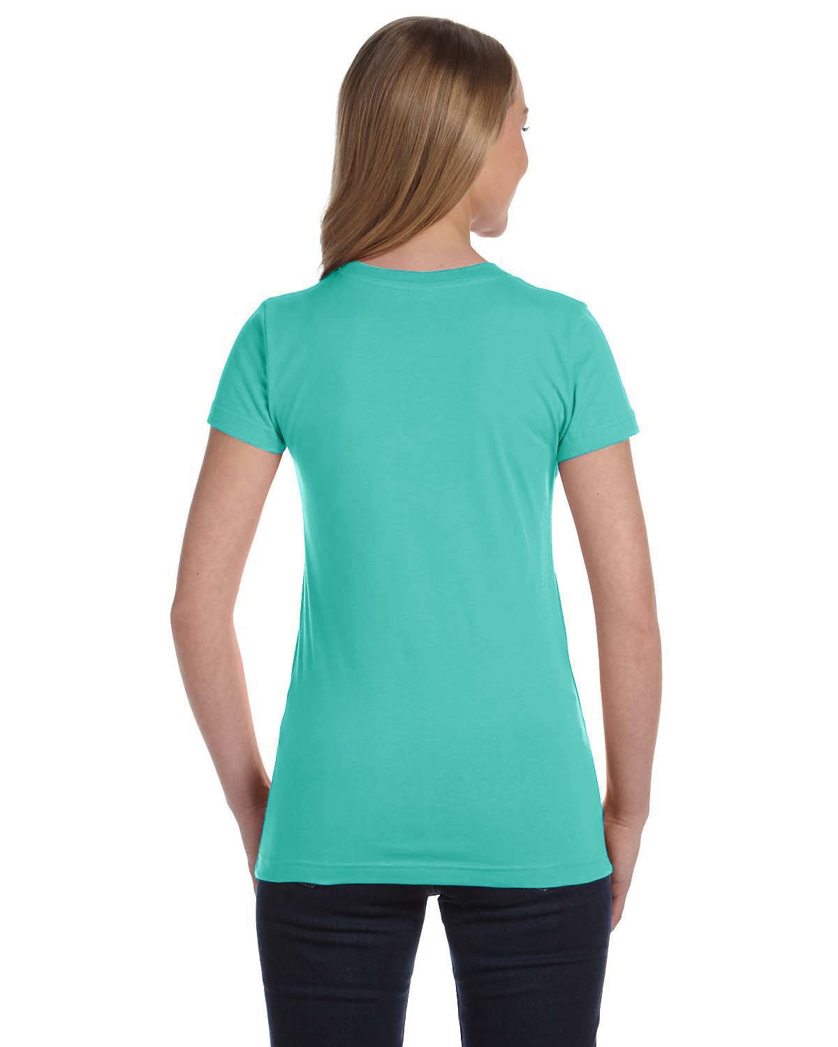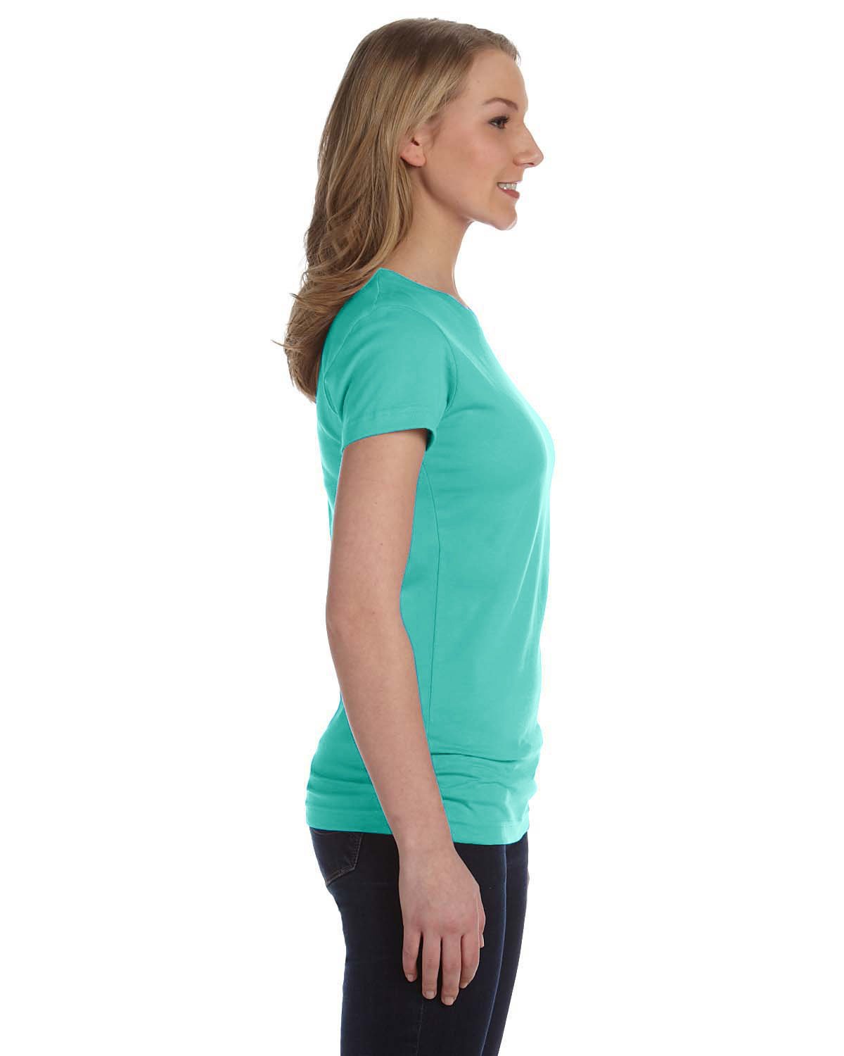 4.5 oz., 100% combed ringspun cotton fine jersey ; Ash is 98/2; Heather is 93/7 combed ringspun cotton/polyester; Ash and White are sewn with 100% cotton thread; Topstitched ribbed collar; Self-fabric back neck tape; Double needle sleeves and bottom hem; Side seam construction; EasyTear™ label; Machine washable/ tumble dry low; Fit: Ladies’ Junior – Fitted