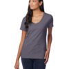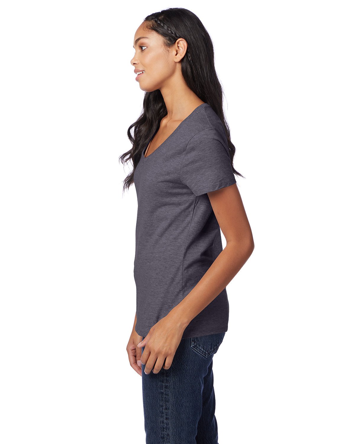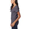4.5 oz., pre-shrunk 100% ringspun cotton, 30 singles; Ash is 99/1, Light Steel is 90/10; Made with sustainably sourced USA grown cotton; Contoured and sideseamed for feminine fit; Stylish mitered V-neck; Set-in narrower rib collar; Self-fabric neck tape for comfort; Double-needle hem and sleeves; Clean Canvas Technology for superior printability; Tear-away label; “A-” list status from CDP (Carbon Disclosure Project); Energy Star Partner of the Year (14 consecutive years); Every piece of Hanes apparel purchased from our company qualifies for Hanes4Education