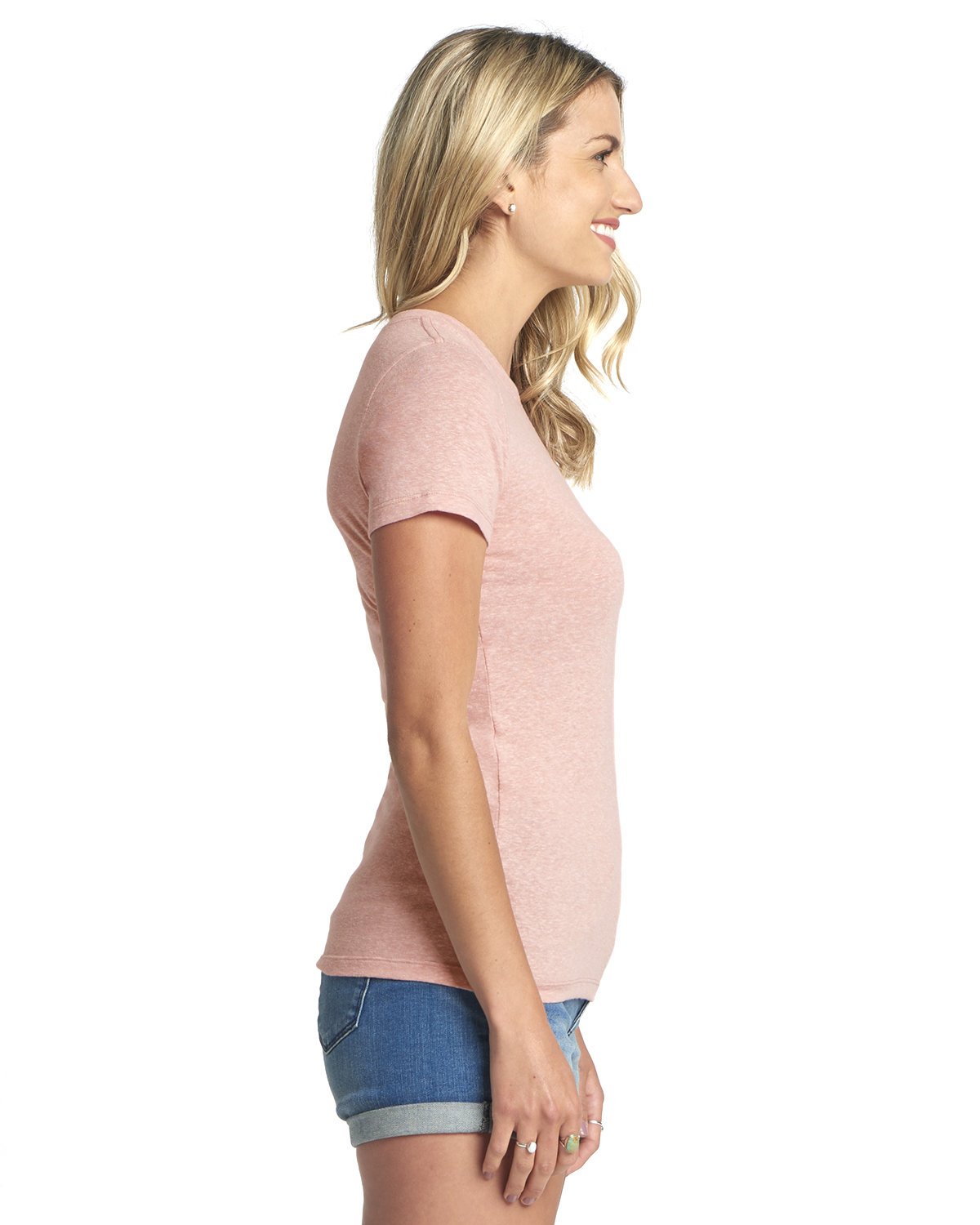 4.3 oz., 32 singles; 50% polyester, 25% combed ringspun cotton, 25% rayon jersey; Note: The Polyester content is transitioning to Recycled Polyester. Mixed inventory may occur.; Fabric laundered for reduced shrinkage; Front coverstitched 1×1 baby rib-knit set-in collar; Satin label; Sideseamed; Next Level Apparel has a recycling program for all fabric waste collected from the cutting process. All fabric scraps are sent to a recycling company that cleans and processes them to be used for cushion filling, rugs, etc. To date, 24.3M pounds of fabric have been recycled.