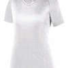 100% polyester wicking knit with true hue technology; True hue technology prevents dye migration; Wicks moiusture away from the body; Ladies’ fit; Updated fit has longer length and bigger chest for added comfort; Tear away label; V-neck collar; Raglan sleeves