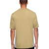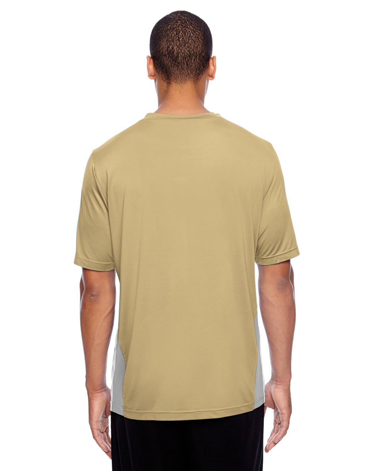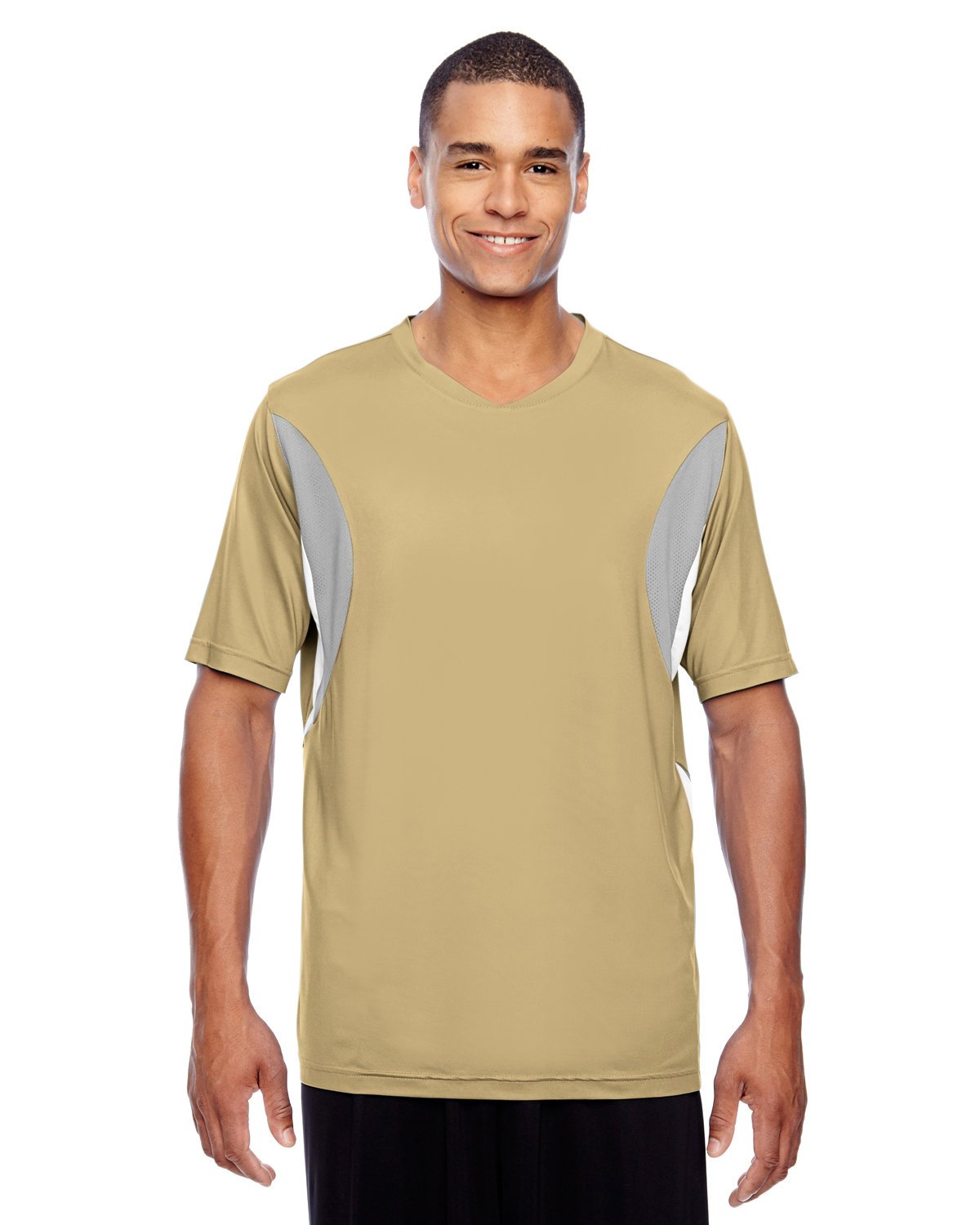5 oz, 91% polyester, 9% spandex pointelle mesh side panels in Sport Silver; Moisture-wicking and anti-microbial; Cationic dyes to ensure superior brightness and excellent color fastness; Athletic fit; Sewn in shoulder tape; Double-needle stitching at hems; Self-fabric athletic v-neck trim