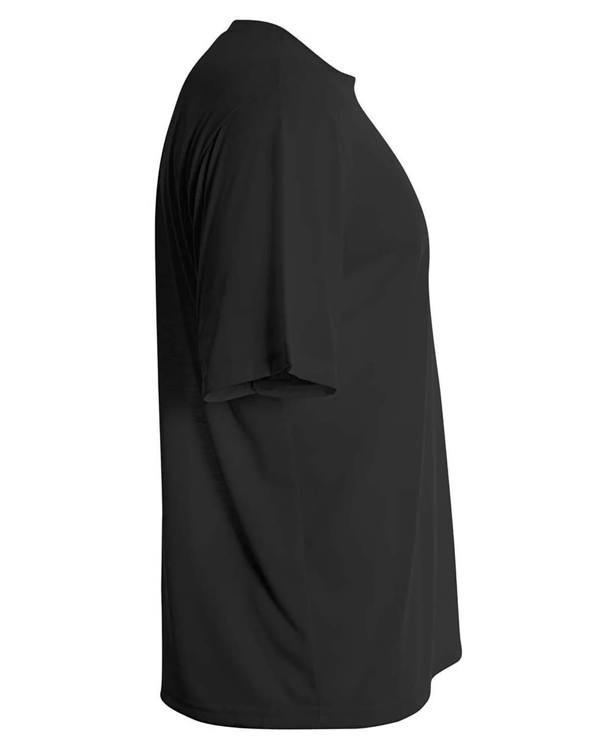 100% spun polyester, 4.7 oz.; Combed ring-spun polyester; Contains moisture-wicking, stain release, and is odor resistant; Taped shoulder seams