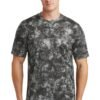 This moisture-wicking tee features an allover sublimated print that has a granite-like look. 4-ounce 100% polyester interlock Tag-free label Set-in sleeves
