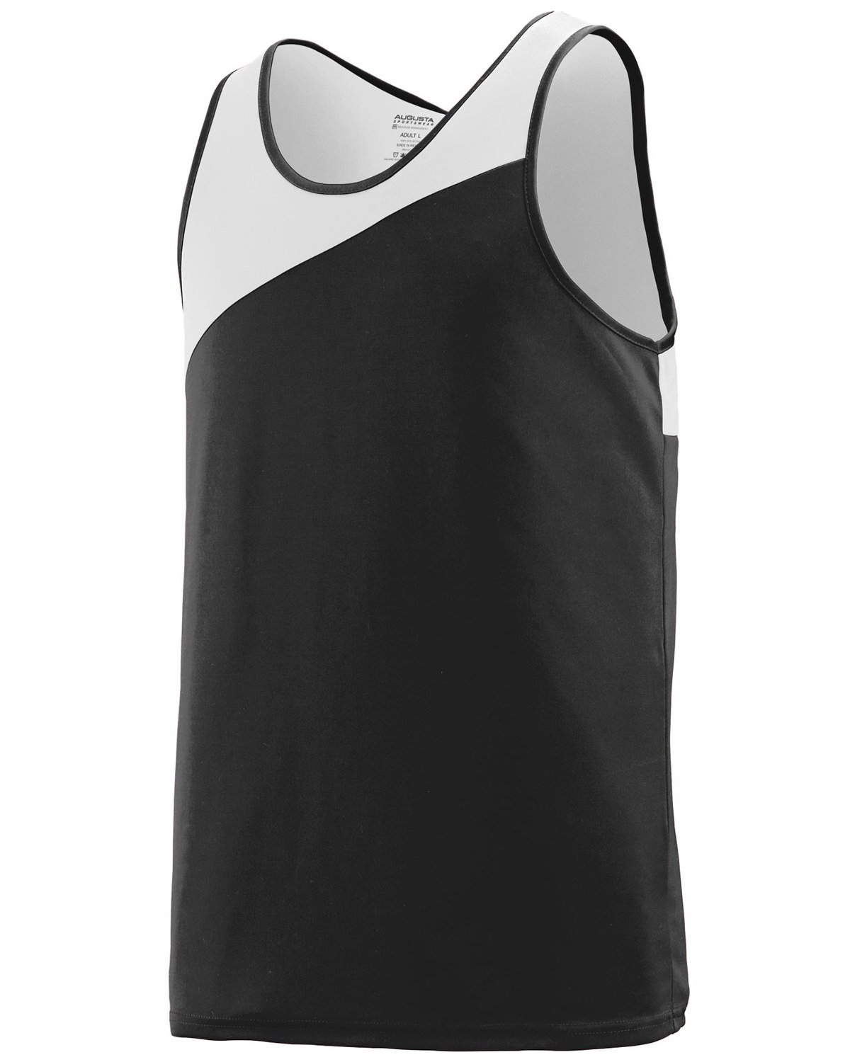 100% polyester wicking knit ; Wicks moisture away from the body; Pad print label ; Self-fabric binding at neck and armholes; Asymmetrical contrast color yoke; Double-needle hemmed bottom